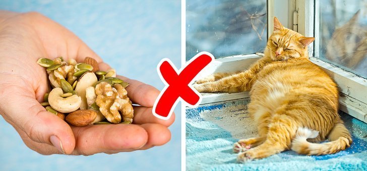 Nuts contain a high amount of fats which can result in weight gain and although they are a healthy snack for humans, they are not very so for cats as they cannot be easily digested by them. Additionally, the high content of fats can lead to stomach issues and cause symptoms such as vomiting.