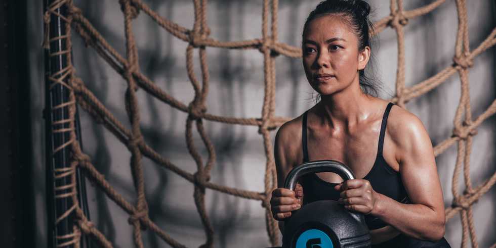 Equipment: resistance band and set of dumbbells or kettlebells—aim for a weight that feels heavy to lift by the last two to three reps.