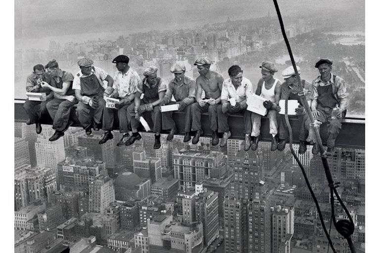 “Lunchtime Atop a Skyscraper” shows construction workers eating lunch 840-feet above ground on break from building what is now the GE Building, 30 Rockefeller Plaza.
