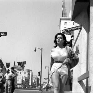 This iconic photo was taken when actress Joan Bradshaw was only 17 as she walked her dog down Hollywood Boulevard. Joan went on to enter many beauty pageants eventually winning Miss Texas USA in 1953 and becoming an iconic pinup girl.