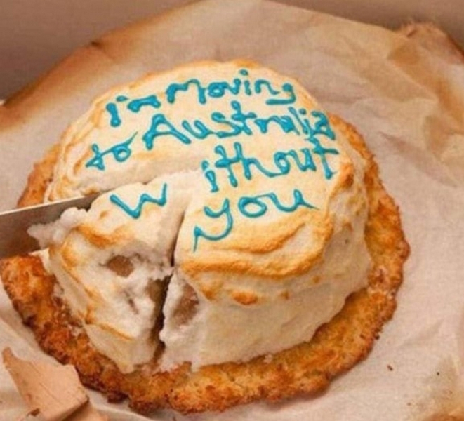 We are huge fans of lemon meringues, and this example looks fantastically yummy. What we do not appreciate, however, is being delivered heartbreaking news in the form of a delicacy! This person will never be able to eat cake again. Maybe opt for a less scrumptious form of communication next time.