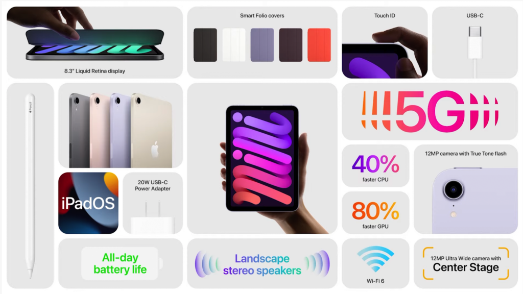The new iPad Mini is bigger, comes in four colors, has USB Type-C (not lightning,) 2nd Gen Apple Pencil support, 5G, TouchID, and improved 12MP cameras on both the front and the back. Like its bigger brother, the iPad Mini 12MP front camera has the Center Stage feature from the iPad Pro.