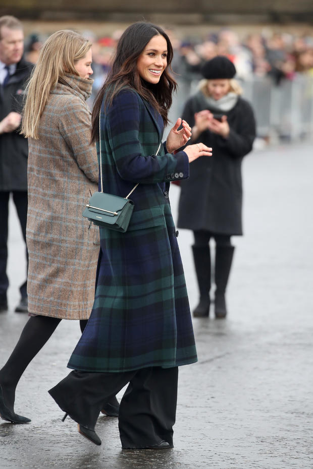Meghan wore a blue and green plaid Burberry coat to a visit to Edinburgh with Prince Harry.