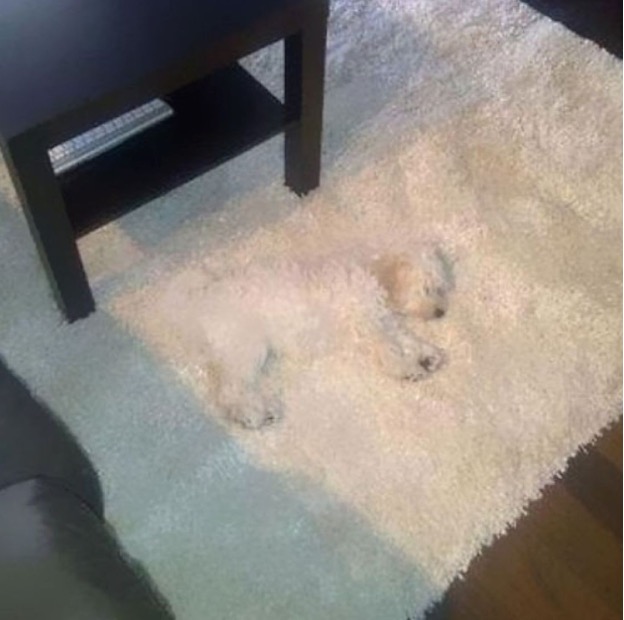 When we first saw this picture, we assumed it was of a stained carpet. After all, it’s a light-colored carpet, and light-colored carpets are renowned for accumulating dirt. That, however, was not the case! In truth, it appears that there is a small dog-napping somewhere where no one can locate him. That’s correct! What better way to get away from the grandchildren than to hide behind a shag rug?